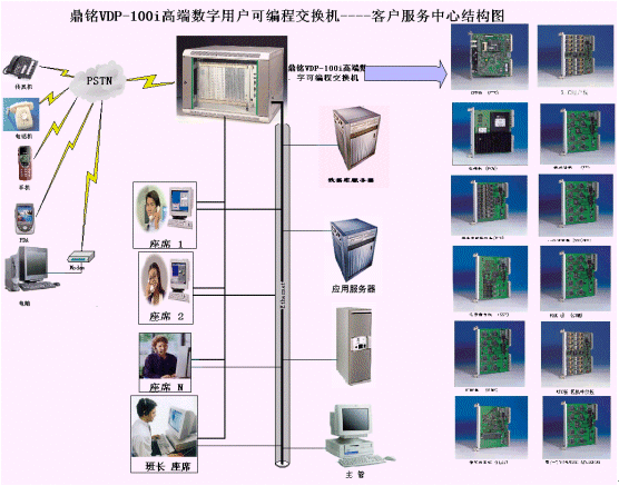 接入平臺(tái)實(shí)現(xiàn)外界接入的控制和話務(wù)交換、資源的合理分配,是構(gòu)建呼叫中心的成功關(guān)鍵所在。DM大型呼叫中心系統(tǒng)接入平臺(tái)采用鼎銘VDP-100i高端數(shù)字可編程交換機(jī),該交換機(jī)所有資源板卡都采用了高集成度、功能模塊設(shè)計(jì)思想。該接入平臺(tái)的結(jié)構(gòu)如上圖所示的右邊(詳細(xì)的功能模塊資源板請(qǐng)參閱《鼎銘高端數(shù)字可編程交換機(jī)產(chǎn)品手冊(cè)》),用戶可以根據(jù)實(shí)際情況靈活配置和增減系統(tǒng)的接入方式、資源類(lèi)型、資源數(shù)量,達(dá)到資源的充分合理利用的目的。