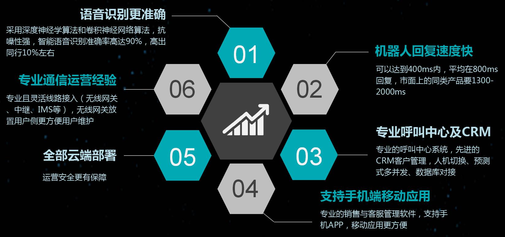 真人式語音群呼、語音識別轉化成文、客戶篩選分類管理、多維統(tǒng)計圖表、實時監(jiān)控平臺、配套的全國碼號資源及通話線路資源。