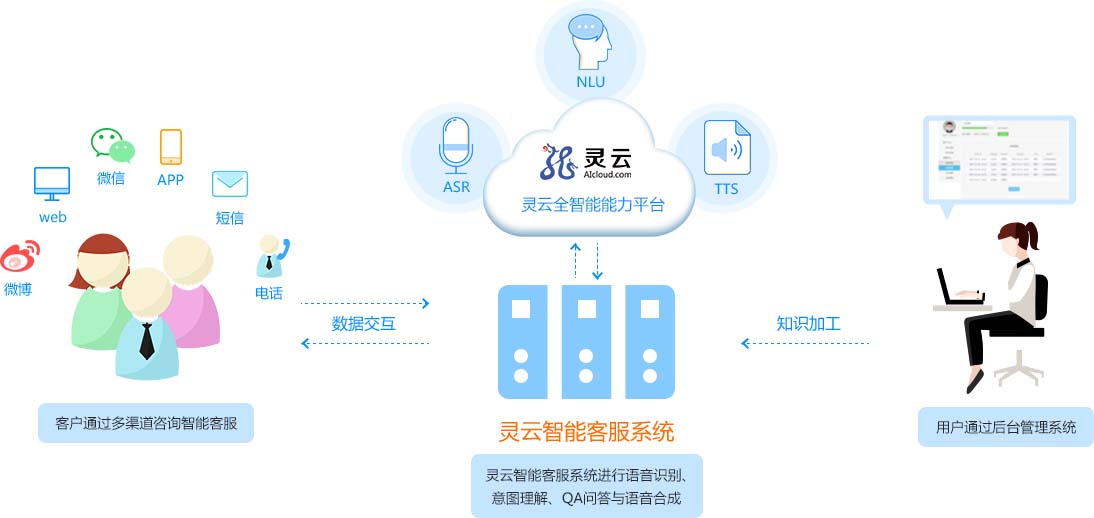 客戶通過電話、微信、網頁等多種渠道咨詢智能客服,靈云全智能客服系統(tǒng)進行語音識別、意圖理解、QA問答與語音合成,企業(yè)通過后臺管理智能客服系統(tǒng)。
