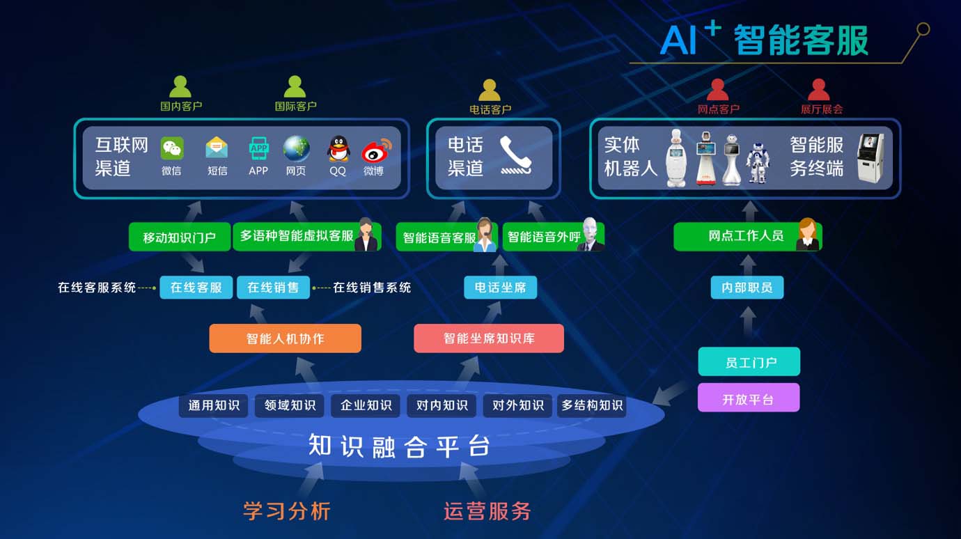 多種渠道融合:覆蓋網頁、微信、短信、APP、實體機器人等多種客服渠道,通過文本、語音、圖像等不同展現(xiàn)方式,充分利用互聯(lián)網和移動設備,與用戶之間進行溝通交互