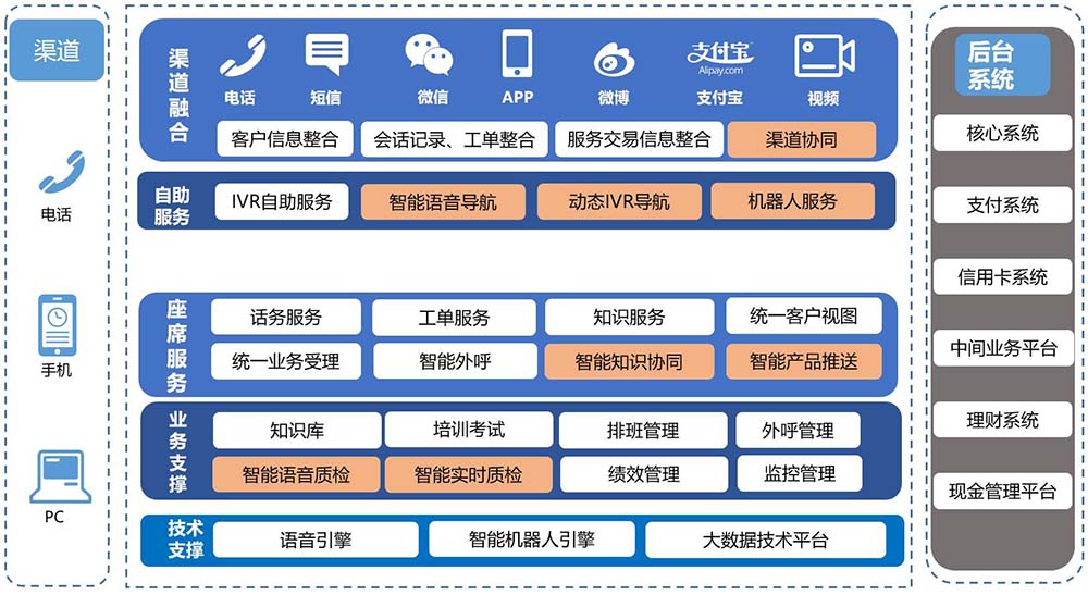 智能鑒權、智能語音導航、智能路由、智能知識庫匹配、智能質檢、智能外呼