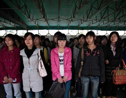 在一個(gè)周一上午,約3000名外來工人在深圳的富士康招聘中心門前,希望獲得在富士康的工作機(jī)會(huì)。