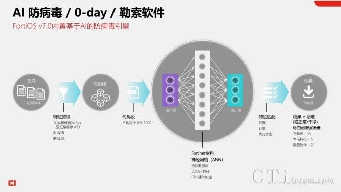 目前,AI技術(shù)已深度融入Fortinet的數(shù)十種產(chǎn)品與方案中。在最新版的統(tǒng)一網(wǎng)絡(luò)安全操作系統(tǒng)FortiOS 7.6中,就已經(jīng)內(nèi)置了由FortiGuard AI實驗室研發(fā)的基于AI的防病毒引擎。該引擎運(yùn)用神經(jīng)網(wǎng)絡(luò)技術(shù),學(xué)習(xí)并區(qū)分海量病毒文件與正常文件,通過分類打分的方式,實現(xiàn)對未知文件與病毒的精準(zhǔn)判斷,無需依賴傳統(tǒng)的病毒特征庫。因此,F(xiàn)ortinet的FortiGate等產(chǎn)品在防病毒方面擁有雙引擎加持,既有傳統(tǒng)的基于病毒特征庫的防病毒引擎,又有基于AI的下一代防病毒引擎(Anti-virus NGAV),雙重保障,安全無憂。