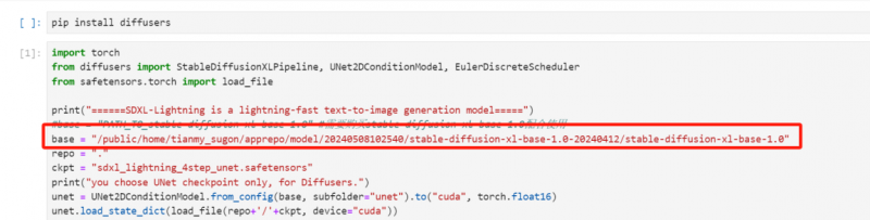 第三步,商城首頁中選擇 SDXL-Lighting 系列模型商品,免費購買后點擊“一鍵試用”。進入notebook頁面后選擇“Python3.9”內(nèi)核,將第二步復(fù)制路徑粘貼到代碼的 base 變量中,點擊保存。