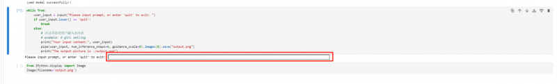 第四步,點擊shift+enter運行,運行完后在紅框處填寫想生成的圖片文字描述,再點擊 shift+enter 運行,就會出現(xiàn)針對描述所生成的圖片。